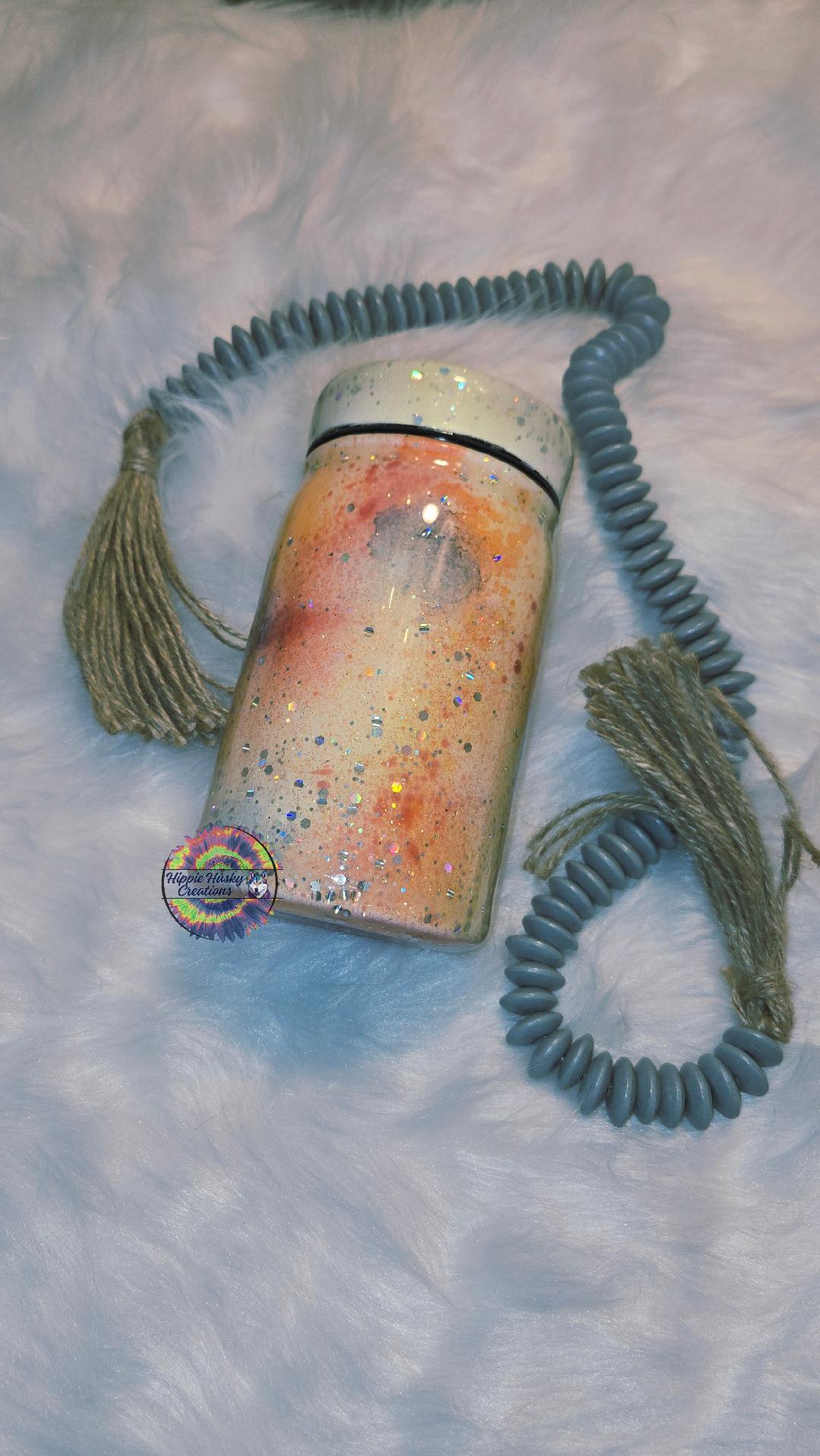 16 oz Mason jar Tumbler. Made out of stainless steel on the inside with art on the outside. this tumbler comes with a lid and straw. Not dishwasher or microwave safe.